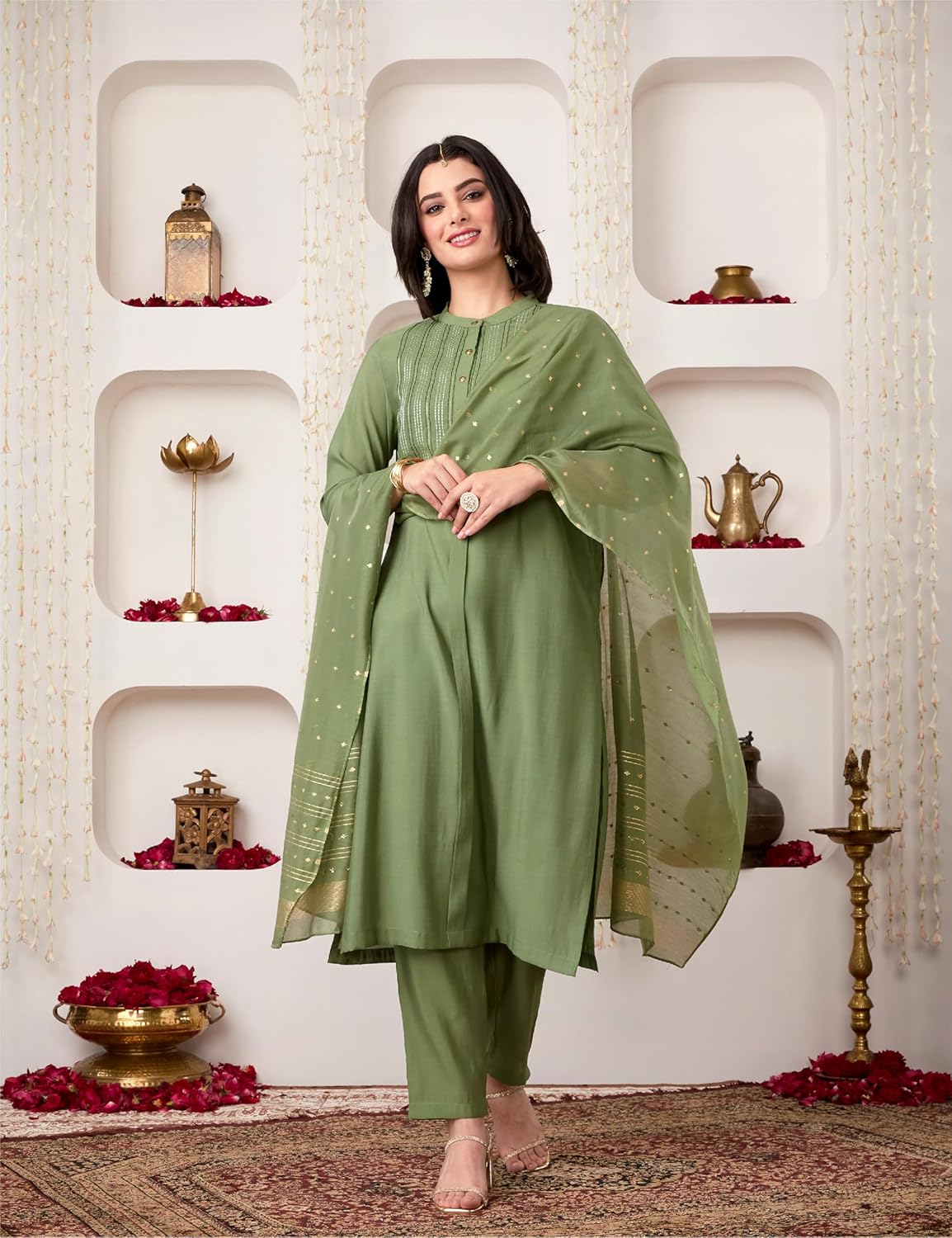 Amazon Brand – Myx presents a sophisticated collection that seamlessly blends elegance with everyday comfort. This refined three-piece ensemble features a kurta with an intricately embroidered yoke and thoughtfully designed extended placket with metal buttons, masterfully crafted in premium viscose-rich blend fabric. The look is elevated by a distinguished dupatta with zari highlights, striking the perfect balance between professional and occasion wear. Perfect for the modern professional, this versatile set transitions effortlessly from office hours to evening gatherings, embodying grace and sophistication in every detail.