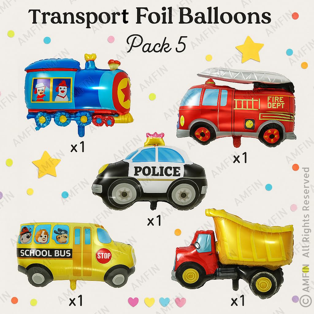 AMFIN Transport theme birthday decoration/Bus foil balloon/School Bus Foil/Kids Decoration Items/Train Foil Balloon for Kids Party/Police Theme foil – Pack of 5