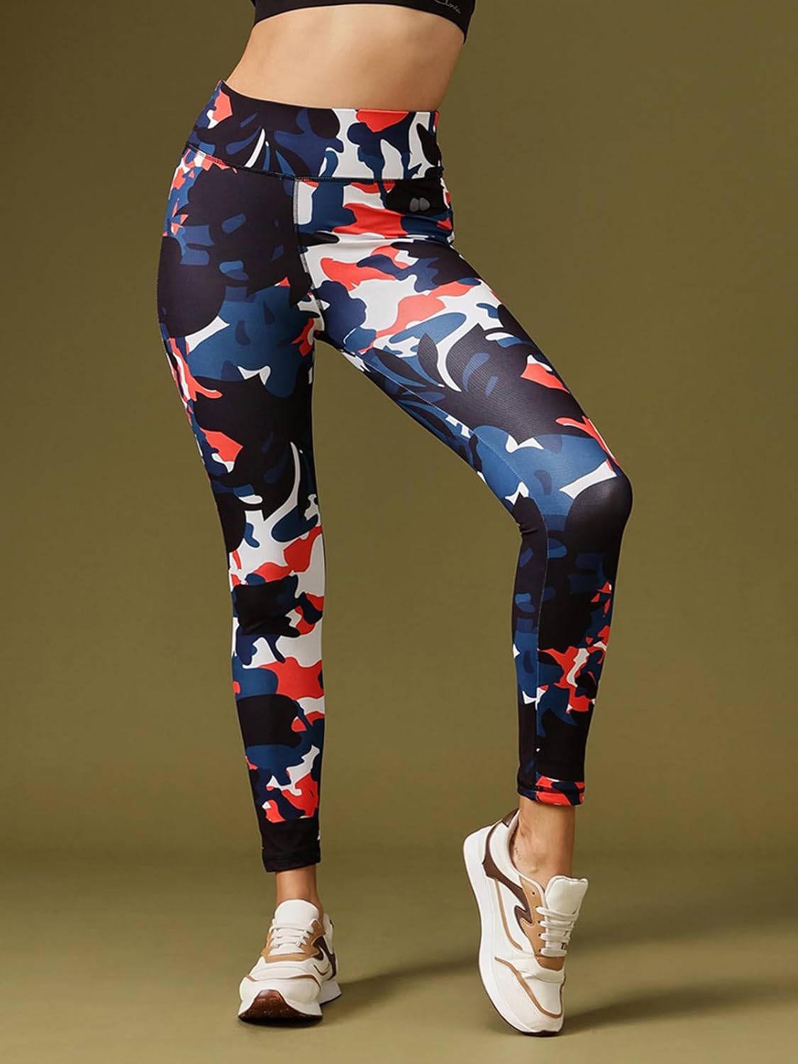 Blue ankle-length tights crafted with soft moisture wicking polyamide spandex fabric.Designed with white, peach colour black camouflage print.Has great elasticity, is resistant to perspiration, and is comfortable.Soft elastic at the waistband leg openings for a snug fit.Has broad elastic for extra tummy support.Elastic enclosed in a soft fabric for utmost comfort.Provides ease of movement and avoids wear or tear.Maximises flexibility, mobility performance.Perfect for cycling, running, Zumba, etc.
