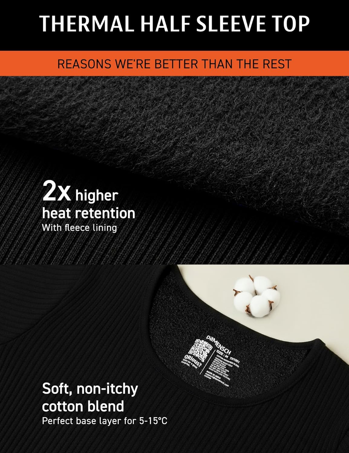 DAMENSCH HeatCode Half Sleeve Warmer for Men, Cotton Blend Winter Inner, Fleece Lined Ribbed Thermal Wear for Men Top, Super Soft Body Warmer Full Sleeves Topwear