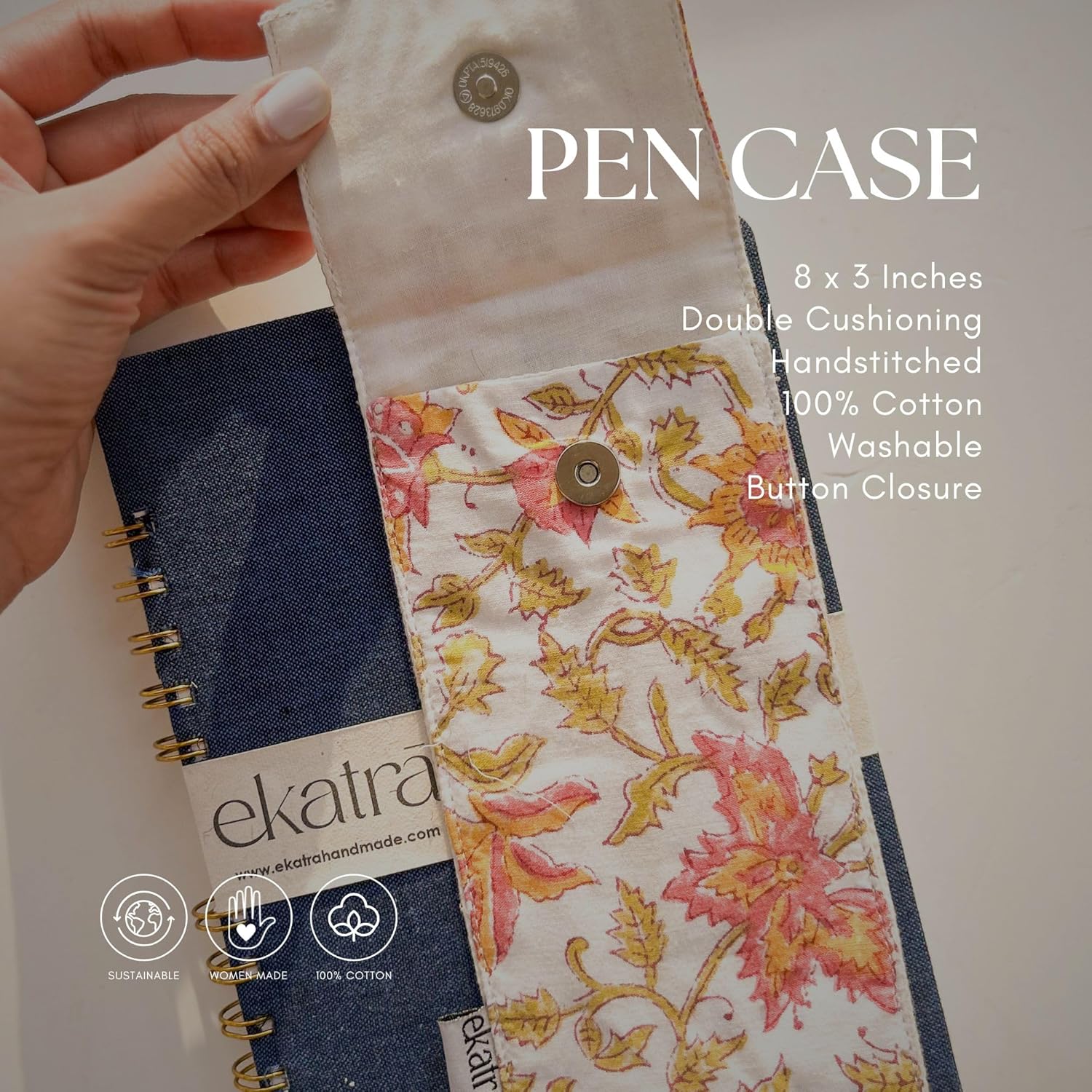 Crafted from upcycled fabric, the case is hand stitched by Ekatra’s women-led artisan team. It includes one large pocket that securely holds up to 8 average-size writing instruments, along with a flap cover that protects your pens from scratches or slipping out.