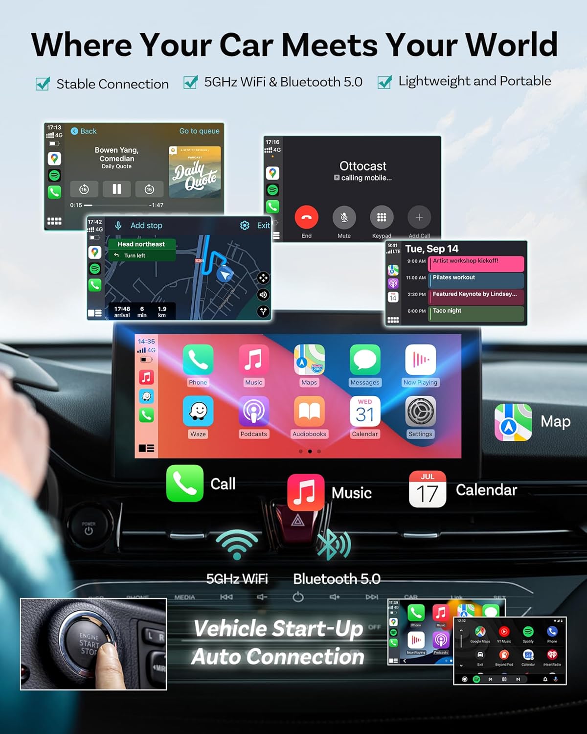 【Distraction-free driving】Connect to your phone, use Siri or Google Assistant to navigate, call, send messages, or listen to music — all without taking your hands off the wheel. Still prefer physical controls, touchscreen, or buttons on your car’s steering wheel? No problem. The Ottocast wireless adapter works in perfect harmony with your vehicle’s original controls