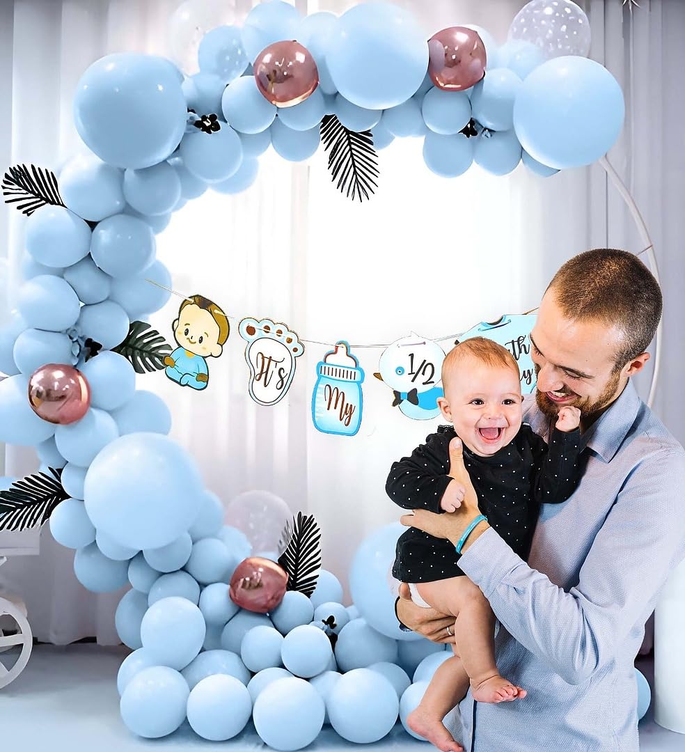 [INSIDE THE BOX] Special You birthday decoration items for boy includes 30pcs blue pastel balloons , 5pcs palm leaves decoration , 5 rosegold chrome balloons for decoration , 1 blue half birthday paper , 1 glue dots tape 1 ballon arch decore strip.