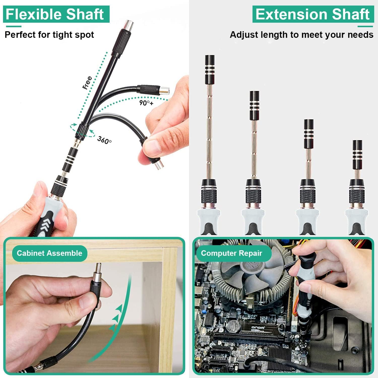 Ergonomic Design: Super smooth rotating cap at the top for easy screw removal. Rubber particle grip streamline handle makes sure you can turn any screw. The included Flexible Extension tool is perfect for removing screws that are just out of reach
